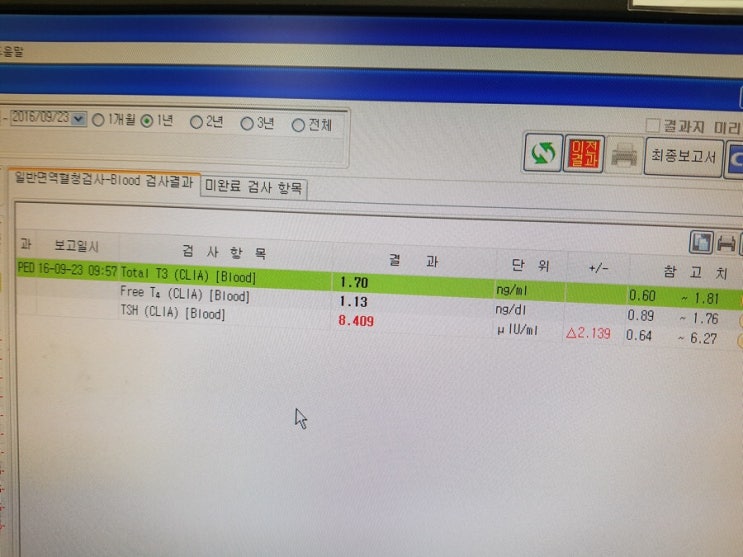 출산한 병원에 전화해서 따로 갑상선 수치를 검사해야 하는지 물어봤더니 선천성 대사 이상 검사에서 정상적으로 나왔다면 굳이 안 해도 된다고 하셨다.하지만 조리원 동기였던 아기도 그렇고 인터넷에서도 정상적으로 나와도 갑상선 수치가 좋지 않았다는 많은 사례를 봤기 때문에 검사를 안 하면 계속 불안할 것 같아 그날 바로 병원에 가서 검사를 했다.