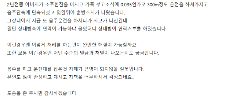 배고파 U 씨 음주운전 어떻게 돼요? 오늘은 딱 이 1건 정도만 설명을 드리도록 하겠습니다. 나머지는 회원님들이 답장을 잘 보내주셨어요 부모님 얘기라고 쓰여있어요. 아드님이나 따님이 작성한 것 같습니다.