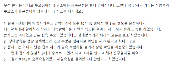 그런데 갑자기 경찰서 가구가 와서 사고 조사를 한다. 그래서 음주검사를 했는데 0.142가 나왔습니다. 채혈 측정은 하지 않았습니다. 2년 전에 아버지가 소주 한 잔 마시고 가족 부고로 또 적발된 적이 있다고 쓰여있어요.