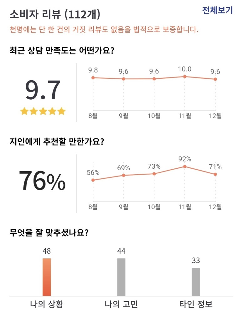 나는 병원을 가든 미용실을 가든 어떤 서비스를 이용하든 리뷰 수와 내용을 꼭 확인하는 편이다. 분명히 나 같은 사람들이 이용하기에 안성맞춤이다.고객 리뷰에 관한 통계 자료가 수치로 나와 있다.