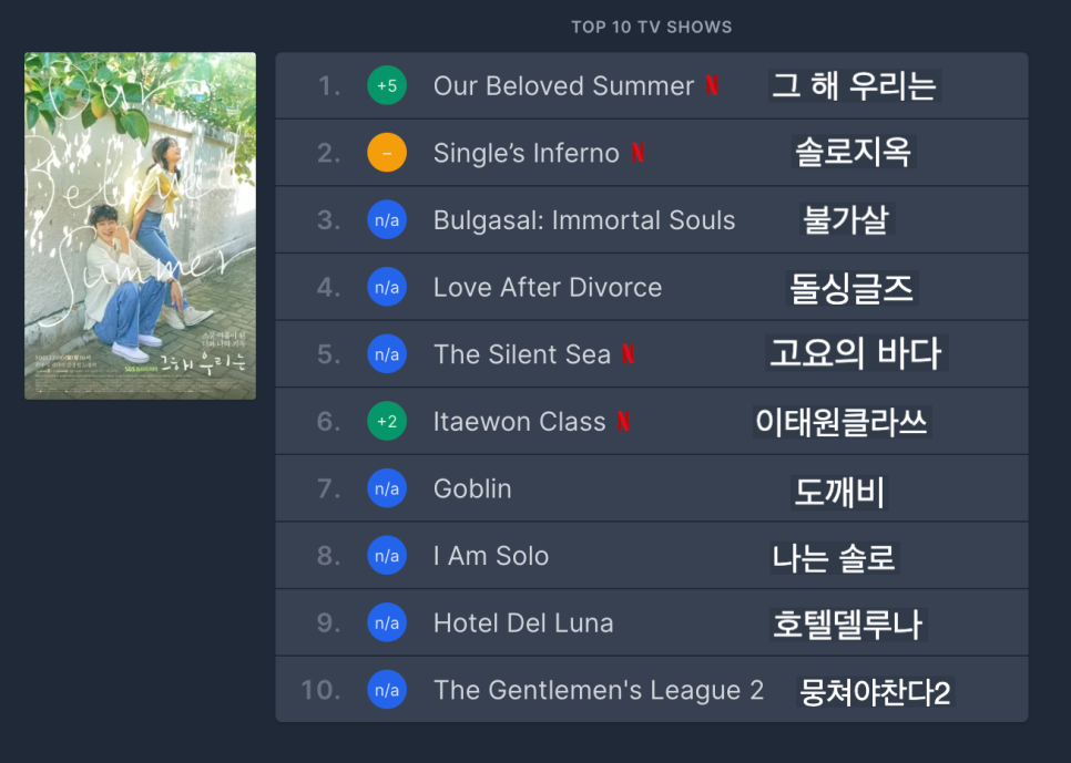 그리고 이것은 TV쇼 부분인데 1. 그 해 우리는 2. 솔로 지옥 3. 불가살 4. 달러 싱글즈 5. 고요의 바다 6. 이태원 크라츠 7. 도깨비 8. 나는 솔로 9. 호텔 델루나 10. 단결해야 한다 2의 순으로 높은 뷰를 기록하고 있었다.
