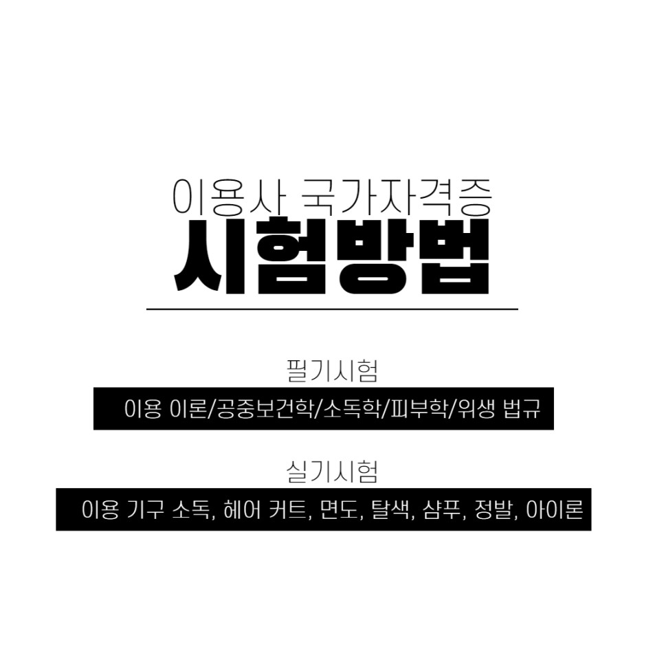 자격시험은 필기이론의 경우 [이용이론, 공중보건학, 소독학, 피부학, 위생법규]까지 5과목으로 구성되어 있으며 객관식 4택다형, 60점 이상으로 합격합니다.