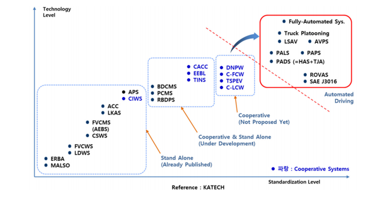 위 그림부터 이미 구현된 부분 이 자율주행 2단계까지다3단계 : 조건부 자동화(Partial Automation : Cooperative & Stnand Alone)- 고속도로와 같은 특정 조건의 구간에서 시스템이 주행을 담당하고 위험 시에만 운전자가 개입하는 수준이다. 주행 제어와 주행 중 변수 감지는 시스템이 담당하며 레벨2와 달리 상시 모니터링을 요구하지 않는다. 단, 시스템의 요구조건을 초과한 경우, 시스템은 운전자의 즉시개입을 요청한다.
