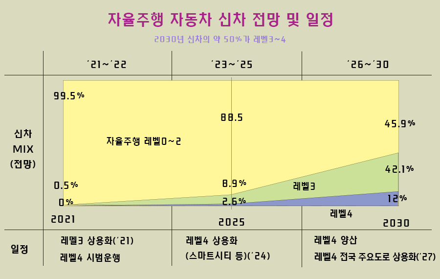 출처 : 산업통상자원부, 국토교통부, 2019년 미래자동차산업발전전략 발표정부는 10월 “2027년 전국 4대 주요 도로 수준의 자율주행, 세계 최초 상용화를 위해 법과 제도, 인프라를 2024년까지 완비하겠다”고 밝혔다. 이는 종전 2018년 2월 발표한 2030년 상용화 시기보다 3년 단축한 계획이다. 2021년에는 고속도로 자율주행이 가능한 레벨3 자율주행차를 상용화하고 2022년에는 시내도로 운행이 가능한 레벨4 자율주행차를 시범 운행할 계획이다. 2024년에는 레벨4의 자율주행차를 일부 상용화해 신차의 50% 정도가 레벨 3~4가 되는 2030년까지 국가경쟁력을 강화할 방침이다.
