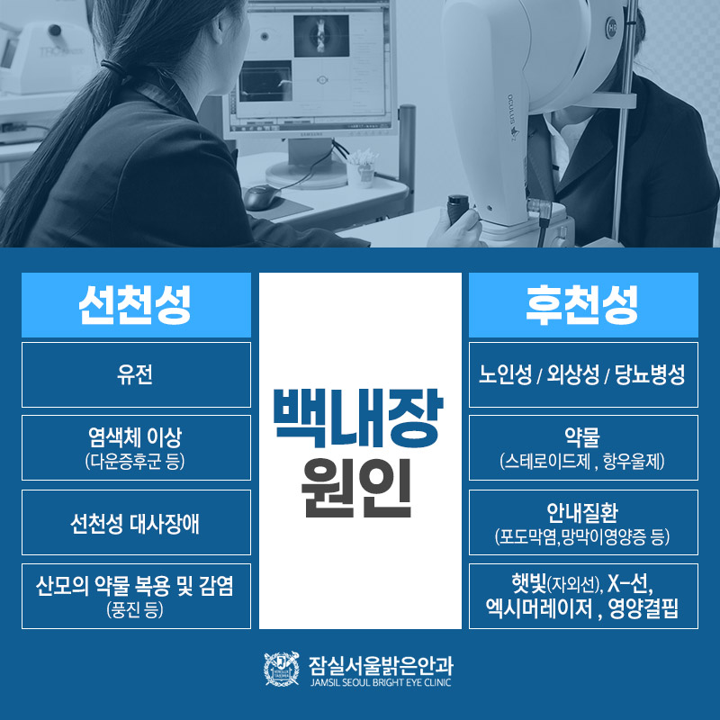 백내장은 선천적인 원인과 후천적인 원인으로 인해 발생했습니다. 그 중 선천적인 원인에는 유전이나 다운증후군 등의 염색체 이상이나 선천성 대사장애, 산모의 약물 복용 및 감염 등이 있으며, 후천적인 원인에는 노화를 포함하여 외상, 당뇨, 방사선 및 자외선 조사, 스테로이드 및 항우울제 약물, 포도막염 등 안질환에 의한 속발성 백내장, 망막 박리나 초자체 수술, 녹내장 수술 등이 있었습니다.