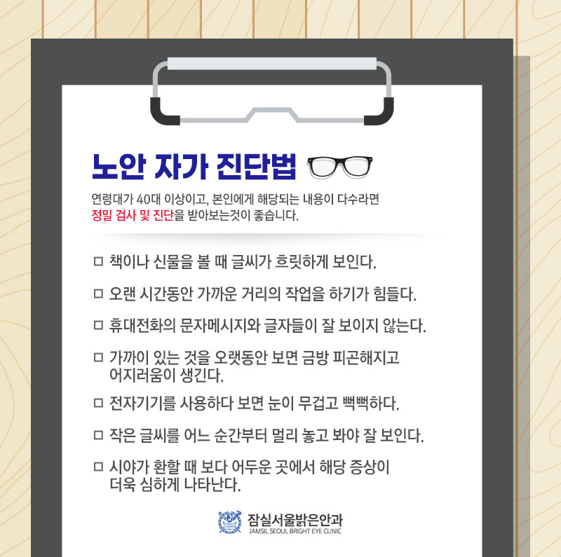 • 책이나 신문을 읽을 때 글씨가 제대로 보이지 않는 경우 – 가까운 거리의 작업을 장시간 하기 어려운 경우 – 휴대전화 메시지나 글씨가 잘 보이지 않는 경우 – 근처에 있는 것을 오랫동안 보면 쉽게 피곤하고 어지러운 경우 – 전자기기를 사용할 때, 쉽게 눈이 무겁고 푸석푸석한 경우 – 작은 글씨를 멀리서 보면 잘 보이는 경우 – 시야가 밝을 때보다 어두운 곳에서 더 어두운 곳에서 잘 보이는 경우 – 시야가 밝을 때보다 어두운 곳에서 더 어두운 곳에서