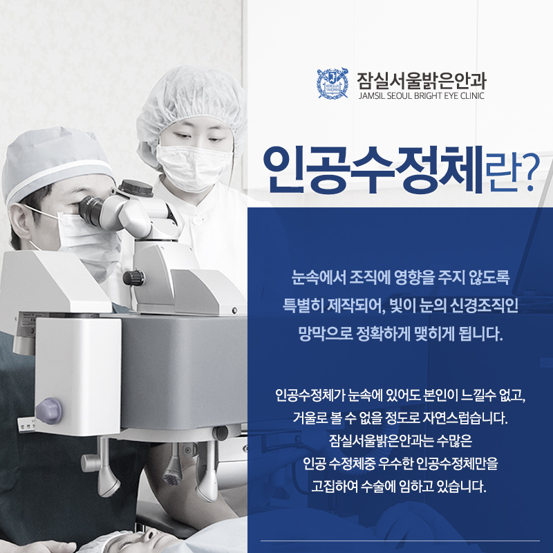 눈 속에 영향을 주지 않도록 제작된 인공수정체는 빛이 눈의 신경조직인 망막에 잘 연결되도록 수정체 역할을 하기 때문에 뚜렷한 시야를 유지할 수 있었습니다.