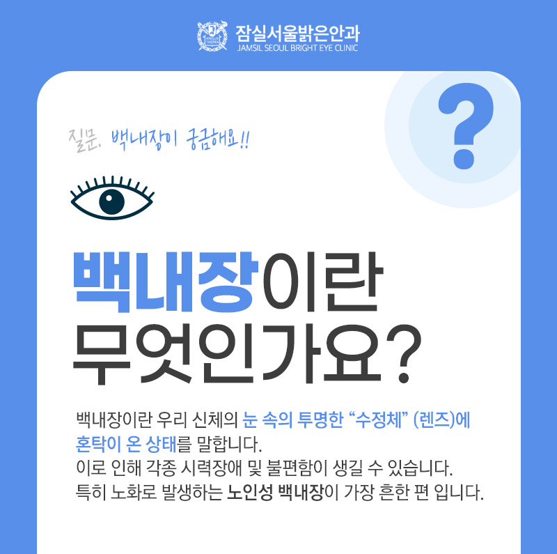 노화를 원인으로 하는 대표적인 눈 질환인 백내장은 눈 속의 투명한 수정체라는 부위에 탁함이 생겨 각종 시력장애를 호소하게 되었습니다.