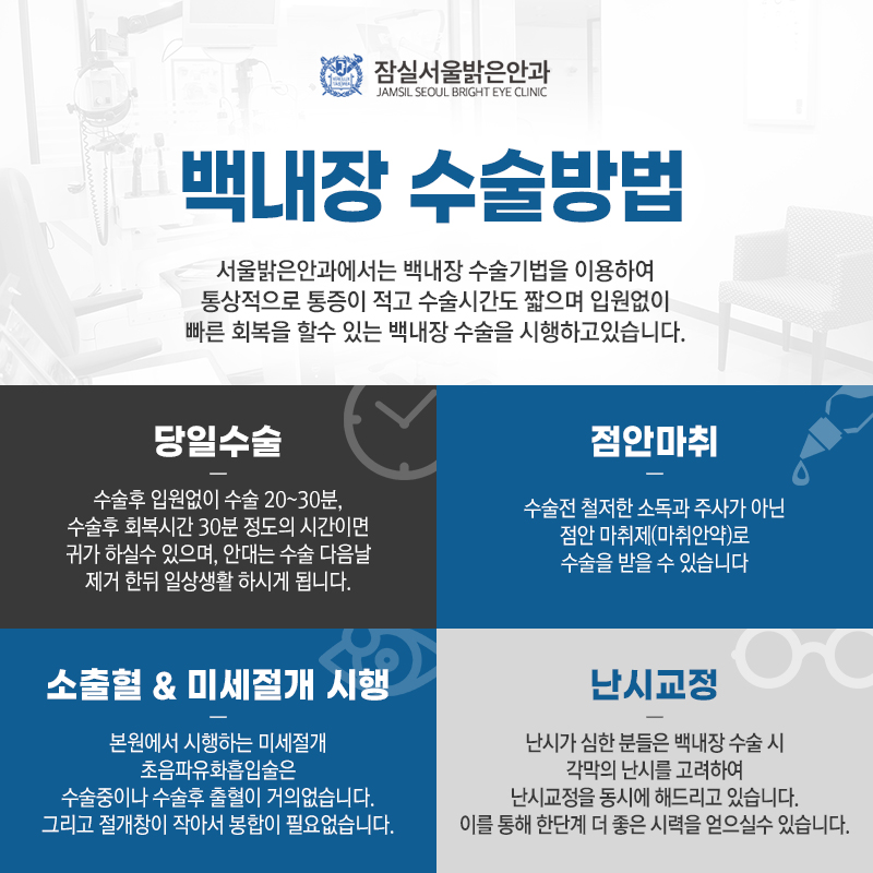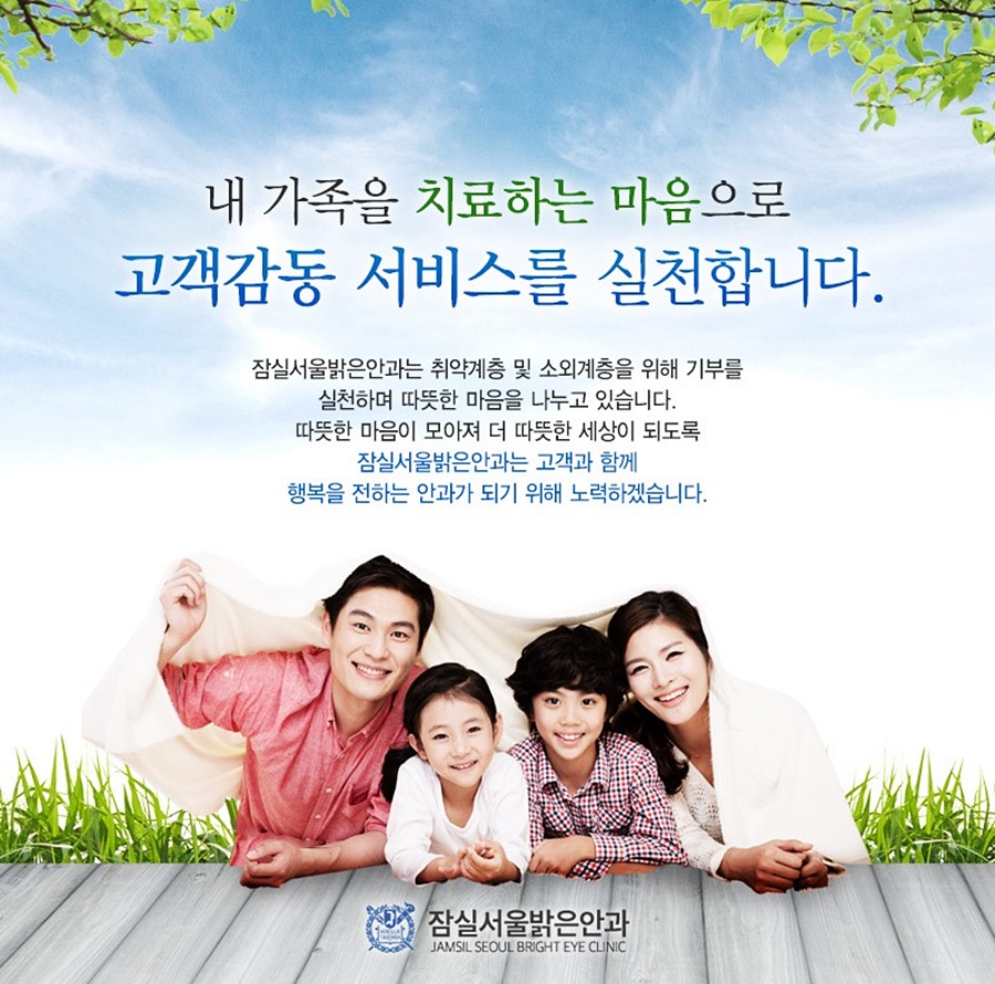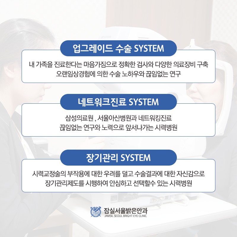 해당 분야에서 오랜 경험과 숙련된 역량을 갖춘 의료진과 함께 잠실역 일각을 오랫동안 지켜온 본원에서는 환자들이 선명한 시야를 유지할 수 있도록 각자의 상태 및 특성에 맞는 적절한 방법으로 1:1 맞춤 치료를 시행하고 있습니다.