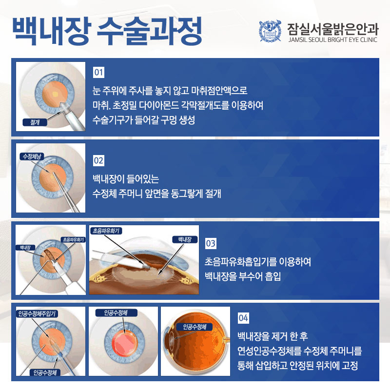 수술은 우선 기구가 들어갈 정도로 작은 절개창을 열고, 백내장이 들어 있는 수정체 주머니 전면을 둥글게 절개한 후 초음파 유화흡입기를 이용하여 탁한 수정체를 부수고 흡입하였습니다. 이후 빈 공간에는 수정체 역할을 대신할 수 있는 연성인공수정체를 삽입하여 안정적인 위치에 고정시키는 방식을 채택하였습니다.