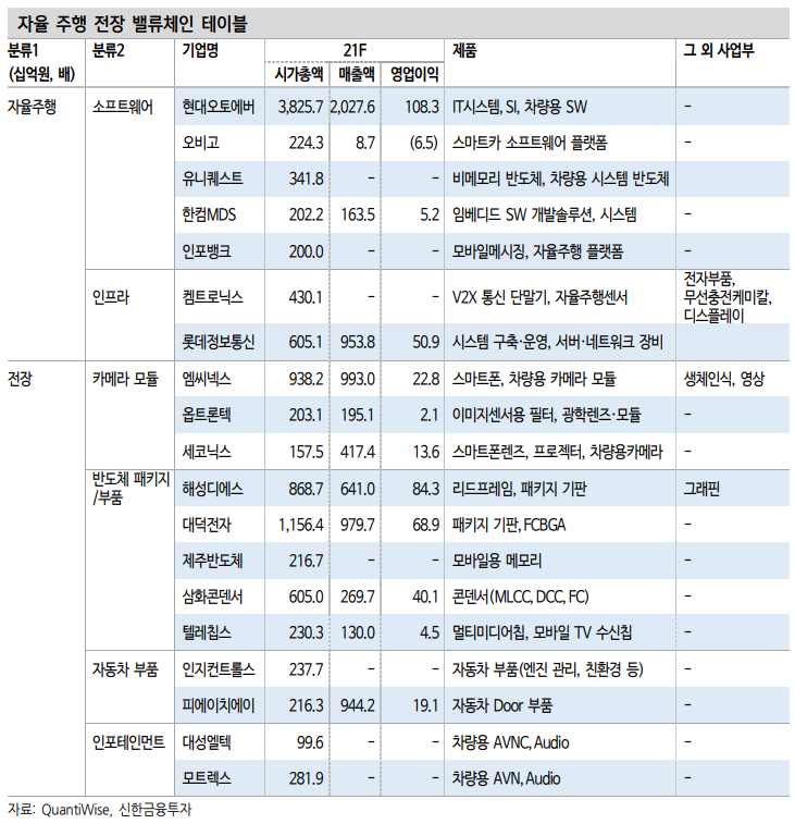 [WHAT?] 자율주행 대장주?진 대장 : 테슬라 차기 대장 : 엔비디아, 모빌아이, 퀄컴 국내 기업 중 주목할 만한 기업 1. 카메라 모듈 : LG이노텍, 삼성전기/엠씨넥스, 패트론, 나무가, 세코닉스, 옵트론텍, 하이비전시스템 2. V2X : 라닉스, 캠트로닉스 **