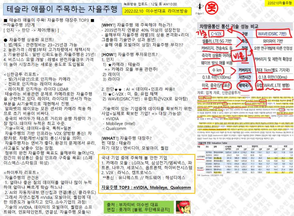 [HOW?] 자율주행 투자포인트? 1. 인지1) ★카메라 : 테슬라 ★> 카메라 모듈 부품 관련주!2) 레이더 3) 라이더 2. 판단 ★★ : AI = 데이터 + 인프라 전투!!1) ★ C-V2X : 미, 중, 유럽 채용2) WAVE (DSRC 기반) : 유럽 (최근 V2X로 교체) 기술력있는 기업 중 데이터를 확보하기 위한 사업 + 실제 확보한 기업 ? => 대장 가능성! – n VIDIA – Mobileye (Intual)