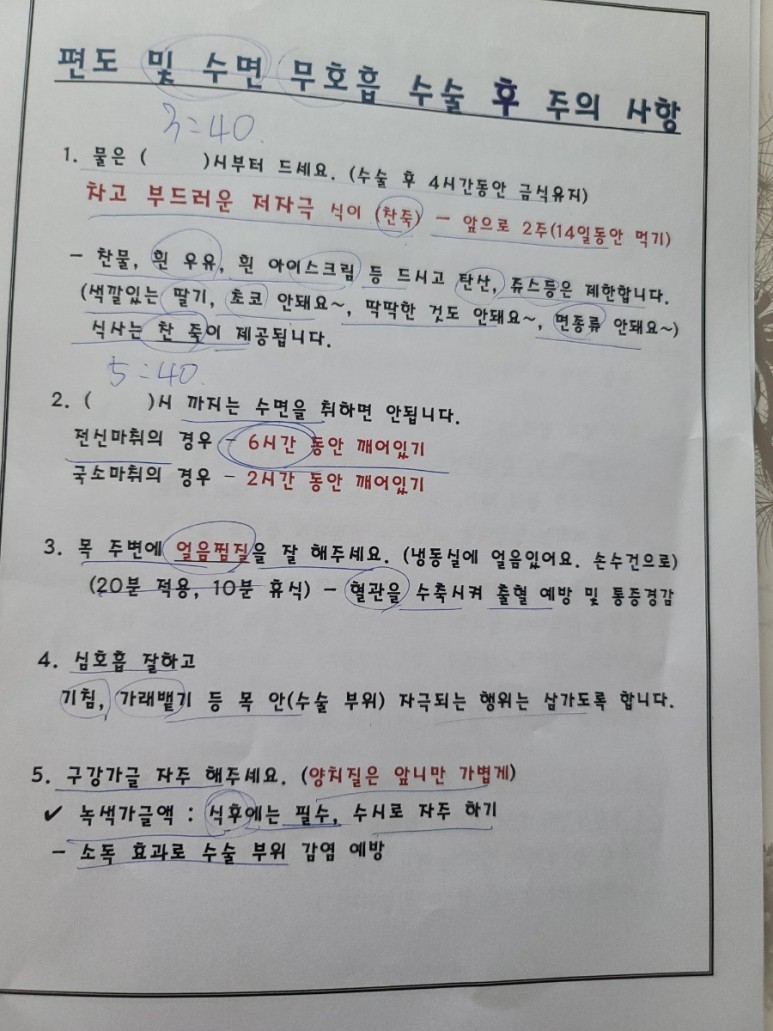 편도 및 수면 무호흡 수술 후 주의사항 1. 수술 후 4시간 단식(4시간까지는 물도 마시지 않는다. 4시간 후에 물을 마셔봐… 괜찮으면 바닐라 아이스크림을 먹어도 된다.) 2. 전신마취의 경우 6시간까지는 수면금지 3. 목 주변에 얼음찜질 4. 심호흡을 자주 하고 기침, 가래를 뱉는 등 목에 자극이 되는 행위는 삼가도록 한다 5. 구강가글액 : 식후에는 필수, 수시로 자주 하기/소독효과로 수술부위 감염을 예방)
