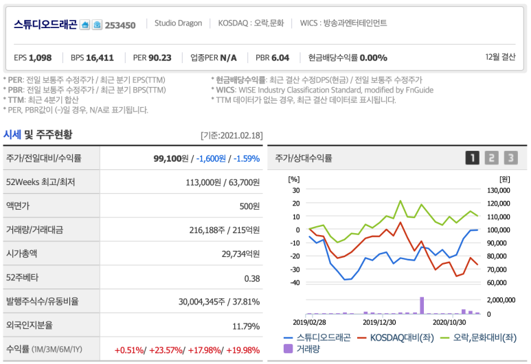 출처 : 스튜디오 드래곤 2021.2.18일 기준 스튜디오 드래곤의 주가는 99,100원이며 PER90.23, EPS1,098원, 약 3조원입니다. 참고로 현재 배당은 없습니다.