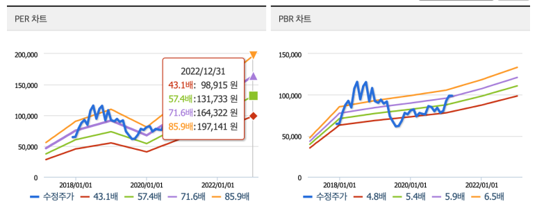 출처 : 네이버 증권에 의해 현재 매출 상승률이 적용되어 PER를 71배만 적용하면 2022년 말 주가는 16만원 정도로 예상됩니다. 안정적으로 57배라도 현재 대비 30% 이상 상승할 여력이 있는 상태입니다.