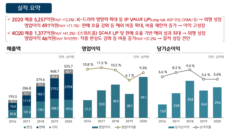 편성이 더 많았어야 했는데 코로나 때문에 제작이 줄었고, 최근 스위트홈 매출이 늘어나 판매 비중도 더 높아졌어요. IR 자료를 봐도 향후 드라마 판매 비중을 2022년까지 70%로 확대한다는 전략입니다.
