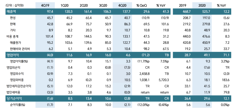 출처 : 네이버 증권 2021.2.4일 ‘20.4Q’ 실적 발표를 보면 매출/영업이익/해외 비중 등 대부분 우상 추세입니다. 코로나 덕분이에요.