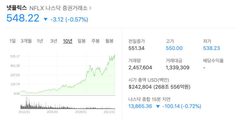 넷플릭스의 주가는 2020년 초 대비 21.2월 현재, 거의 2배의 급등으로 시가총액 268조원을 달성했습니다. 삼성전자 시가총액이 493조원이니까 굉장하지?(덧붙여서 현대자동차 59조원)
