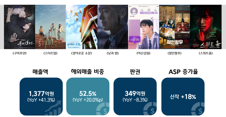 특히 웹툰 원작의 드라마 ‘스위트홈’으로 서양 시청자들에게 큰 인기를 끌 수 있음을 증명하며 향후 스튜디오 드래곤의 판권 단가를 한 단계 인상하는 레퍼런스를 확보했습니다.