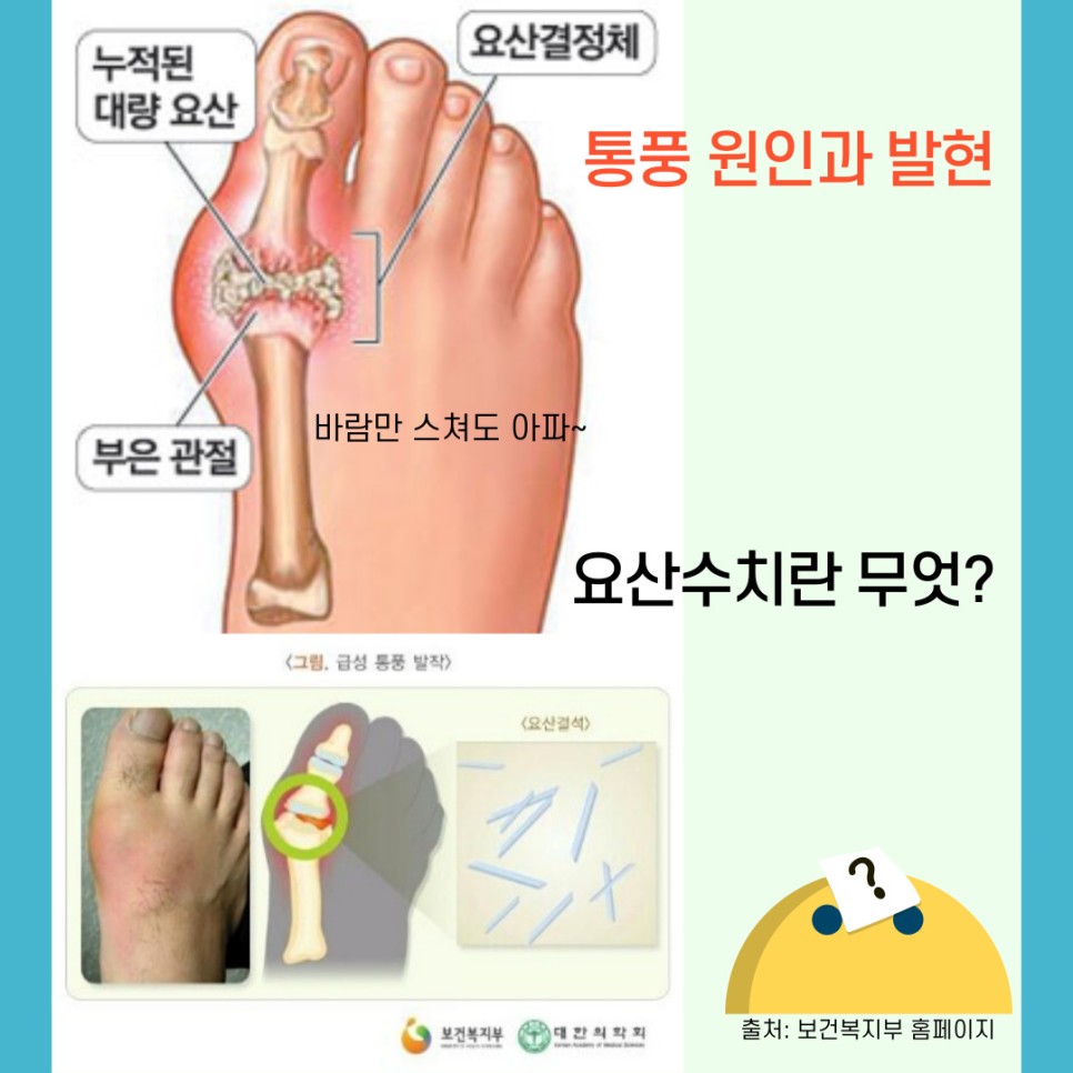 바람만 스쳐도 아프다는 ‘통풍’ 들어보셨나요? 저희 외할머니께서 오랜 지병으로 손가락 관절과 엄지발가락에 통풍 증상을 가지고 계셔서 저에게는 상당히 익숙한 병이지만 인스턴트, 육류 중심의 식습관을 가진 분들이 지속적으로 증가하고 통풍 발병률 또한 상승하고 있다고 하니 함께 잘 알아보고 경각심을 가질 수 있는 기회가 되었으면 좋겠습니다.특히 음식에 대한 주의가 필요한 부분이기 때문에 통풍에 좋은 음식/통풍에 좋지 않은 음식에 대한 정보까지 꼼꼼히 살펴보시기 바랍니다.