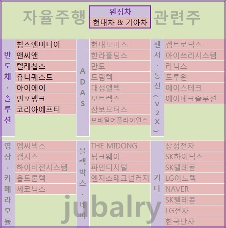 -아이오닛크 5베이스의 무 사람 자동 운전 차…다음 주 독일”2021IAA모 빌러티”실물 전시 예정-미국 자동차 공학회 차원 4수준의 기술 적용. 드라이버의 개입 없이 시스템이 운전 주도-모ー쇼날 첫 상업용 완전 무인 자동 운전 차…2023년 카 쉐어링 회사 리프트 공급 계획 news.hmgjournal.com-뇌파 신호로 운전자의 상태 파악 사고 저감 신기술”엠 브레인”. 졸음 운전·부주의의 대형 사고 예방-올해부터 경기도 공공 버스를 시험 적용. 디지털 헬스 케어의 신기술로 공공 교통 기관의 안전 협력을 강화-심장 박동, 동공 추적에 이어생체 신호의 가장 고난도 기술을 확보, 스마트 시티·PBV에 바이오 기술 적용을 벌렸다 news.hmgjournal.com-다음달 9일부터 정부 세종 청사 인근 6.1km구간에서 로봇 우주선 모델 서비스 개시-소라티 기반 자율주행차에 AI 기반 수요응답형 모빌리티 서비스 ‘샤클’ 융합 – 올 하반기 현대차·기아 남양기술연구소, 내년 상반기 판교 등으로 서비스 지역 확대 news.hmgjournal.com 자율주행 관련주(현대차, 기아차, 현대모비스 주가 및 실적)