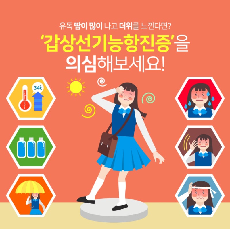 갑상선은 호르몬을 분비하는 내분비 기관으로 갑상선에서 분비되는 호르몬은 에너지 대사 조절과 성장, 발육을 촉진합니다. 갑상선에서 분비되는 호르몬이 과분비가 되면 신진 대사가 너무 활발해져 버립니다. 갑상선 기능 항진증 환자들이 땀을 흘리거나 더위를 견디지 못해 식욕이 늘어나는 이유가 이 때문입니다. 하지만 신진대사가 정상적으로 이루어지지 않기 때문에 체중은 오히려 감소하고 심리적 민감성과 불안을 증대시켜 삶의 질에 영향을 미치는 질환입니다.