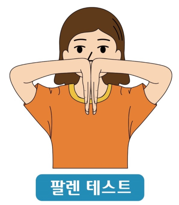 집에서도 쉽게 할 수 있는 손목 터널 증후군의 자가 진단 테스트가 있습니다.손목을 구부린 상태에서 손등을 만지게 하고 1분 정도 이 자세를 유지했을 때 손끝이 저리거나 감각이 무뎌지면 손목터널증후군에 걸릴 수 있다고 생각하여 병원을 찾아보세요.