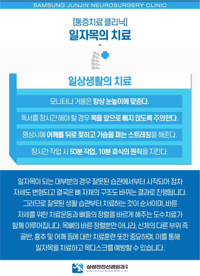광명일자후군을 치료하기 위해서는 우선 일상생활의 치료가 바탕이 되어야 합니다.모니터나 거울은 항상 시선에 맞추고, 독서를 장시간 할 때는 고개를 앞으로 내밀지 않도록 주의해요.