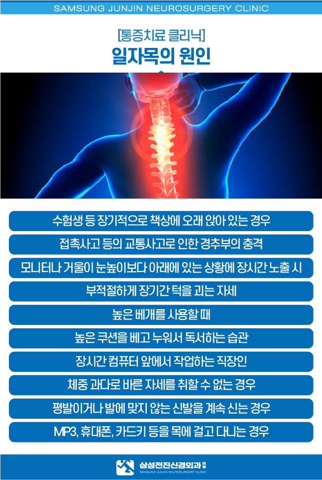 안녕하세요, 여러 가지 통증의 질환을 치료하는 삼성 전진신경외과입니다. 오늘은 여러 통증 질환 중에서도 최근 많은 현대인들이 겪고 있는 척추질환인 스트레이트 목 증후군에 대해 자세히 알아보겠습니다.