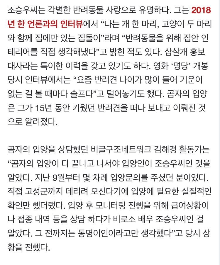 유기견 입양인도 조승우가 동명이인인 줄 알았다고 한다.