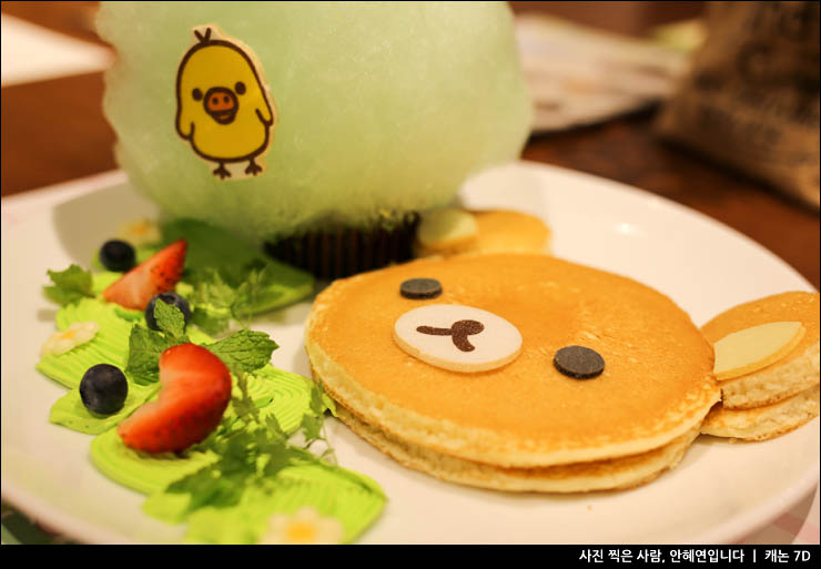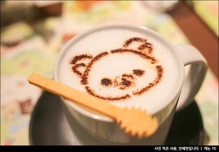 코코아 파우더를 흩뿌려 캐릭터 모양으로.