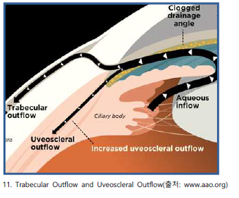 Bimatoprost의 메커니즘을 살펴보면 포도막공막 유출통로의 근육섬유 사이의 간격을 넓혀서 내방수 배출을 활성화시킨다고 합니다