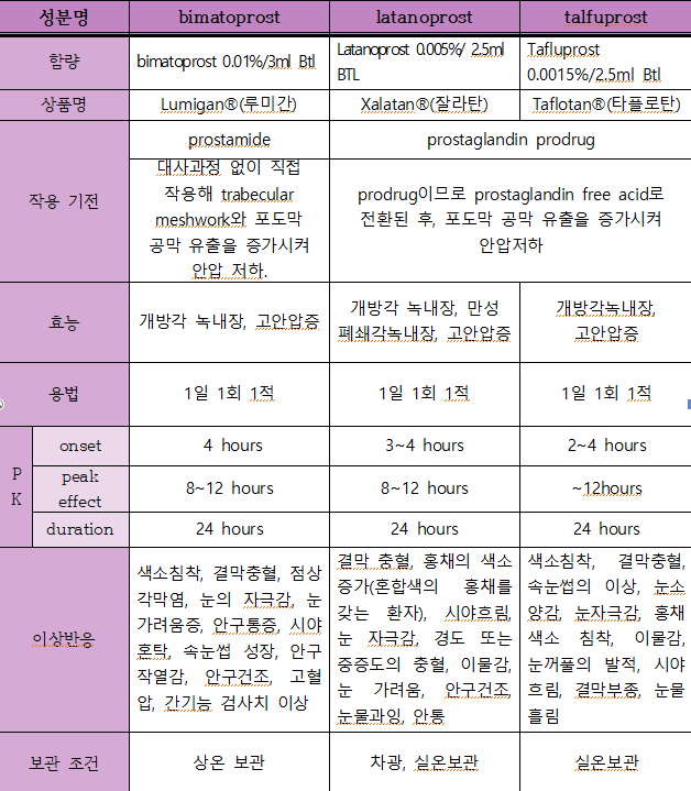위에 그림은 제가! 병원에서 실습할 때 만든 표예요 정말 잘 만들었어요. 새삼 뿌듯하네요.Bimatoprost와 유사한 약품들을 비교한 것입니다.(웃음) 이 약들은 모두 자기 전에 눈에 넣는 경우가 많은데 이는 취침 시 안압이 가장 높을 수 있기 때문입니다. 그리고 조금 특이한 이상반응이 보이나요?바로 ‘속눈썹 성장’입니다.