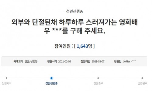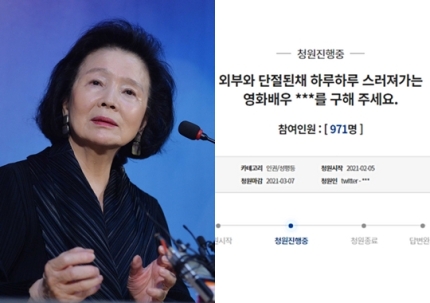 청원인은 과연 누구일까? 배우 윤정희의 현 상황이 안타까워 올린 글인 것은 분명하지만, 한편으로 이 글이 윤정희의 가족, 즉 남편과 딸에게 어떤 영향을 미칠지 좀 더 생각해 봐야 하지 않을까 하는 생각도 든다. 치매는 안타까운 일이며 치매가 아니더라도 직계가족은 가까이 있는 사람이 가장 잘 알 것이다. 국민청원이란 방법밖에 없었나. 누군가의 인생 마지막 여정은 정말 중요하지만, 거기에 더해 누군가의 가족도 중요하다. 어느 한쪽에 대한 일방적 비판은 지양해야 한다. 그리고 언론은 취재 후 기사를 쓰기 바란다.