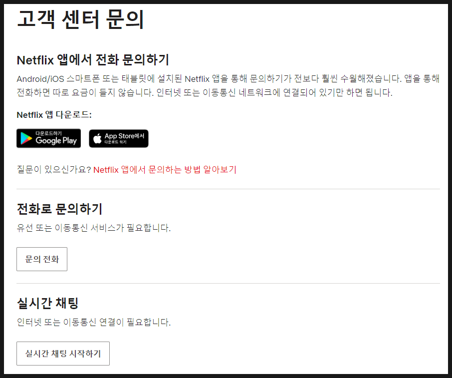 전화로 문의하거나 실시간 채팅으로 넷플릭스에 연락할 수 있다. 나는 빠른 답변과 처리를 원했기 때문에 전화로 문의했다.