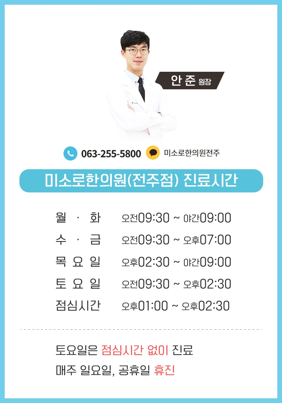 ■ 전주본원에서는 코막힘으로 고생하시는 환자들을 위해 보다 세심한 관리로 부담을 덜어드리고자 평일 월,화,목요일 저녁 9시까지 야간진료를 운영하고 있습니다.