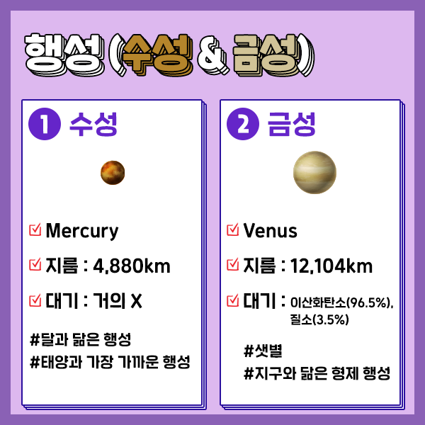 6. 지름은 12,104km로 행성의 크기 중 6번째입니다.대기는 거의 이산화탄소로 구성되어 있기 때문에 망원경으로 표면이 보이지 않는다는 특징이 있어요!겉모습이 지구와 비슷해서 형제 행성이라고도 합니다! (웃음)