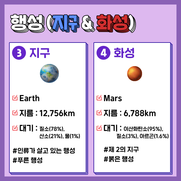 지금까지 태양계 행성 순서와 각각의 특징, 행성들을 영어까지 배웠습니다.
