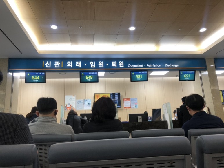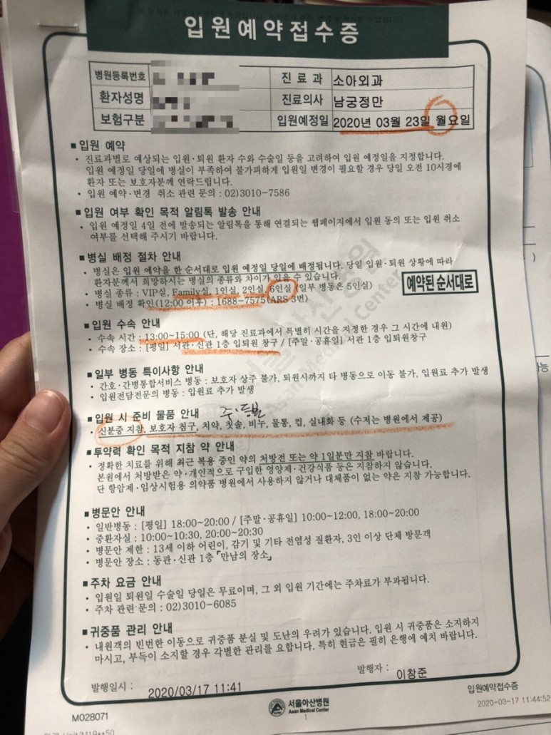 12시에 전화로 6인실 자리가 있는 것을 확인하고 입원 수속을 하려고 아산병원에 왔습니다.
