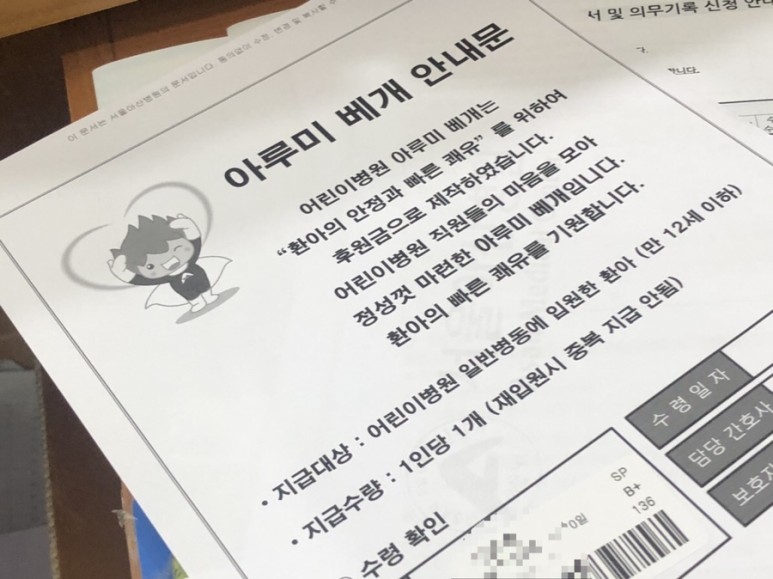 입원 아동에게 주는 알루미늄 베개 선물!!알루미늄 베개가 축복이랑 크기가 비슷해요.