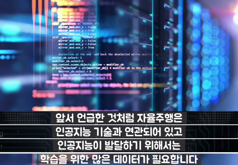 앞에서 말씀드렸듯이 자율주행은 인공지능 기술과 관련돼서 인공지능이 발달하기 위해서는 학습을 위한 많은 데이터가 필요합니다.