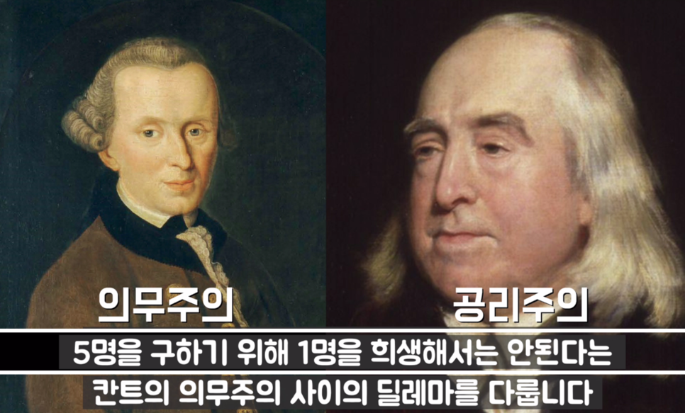 이 문제는 많은 사람을 구하는 것이 옳다는 벤담의 공리주의와 한 사람을 희생시켜서는 안 된다는 칸트의 의무주의 사이의 딜레마를 다루고 있는 것입니다.
