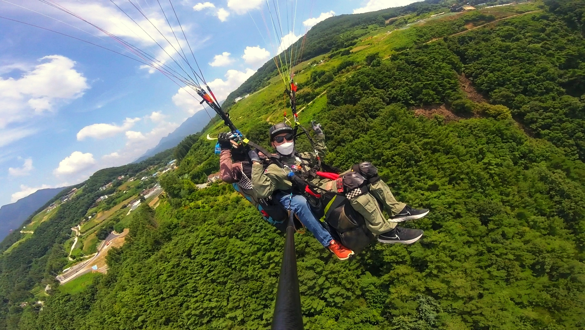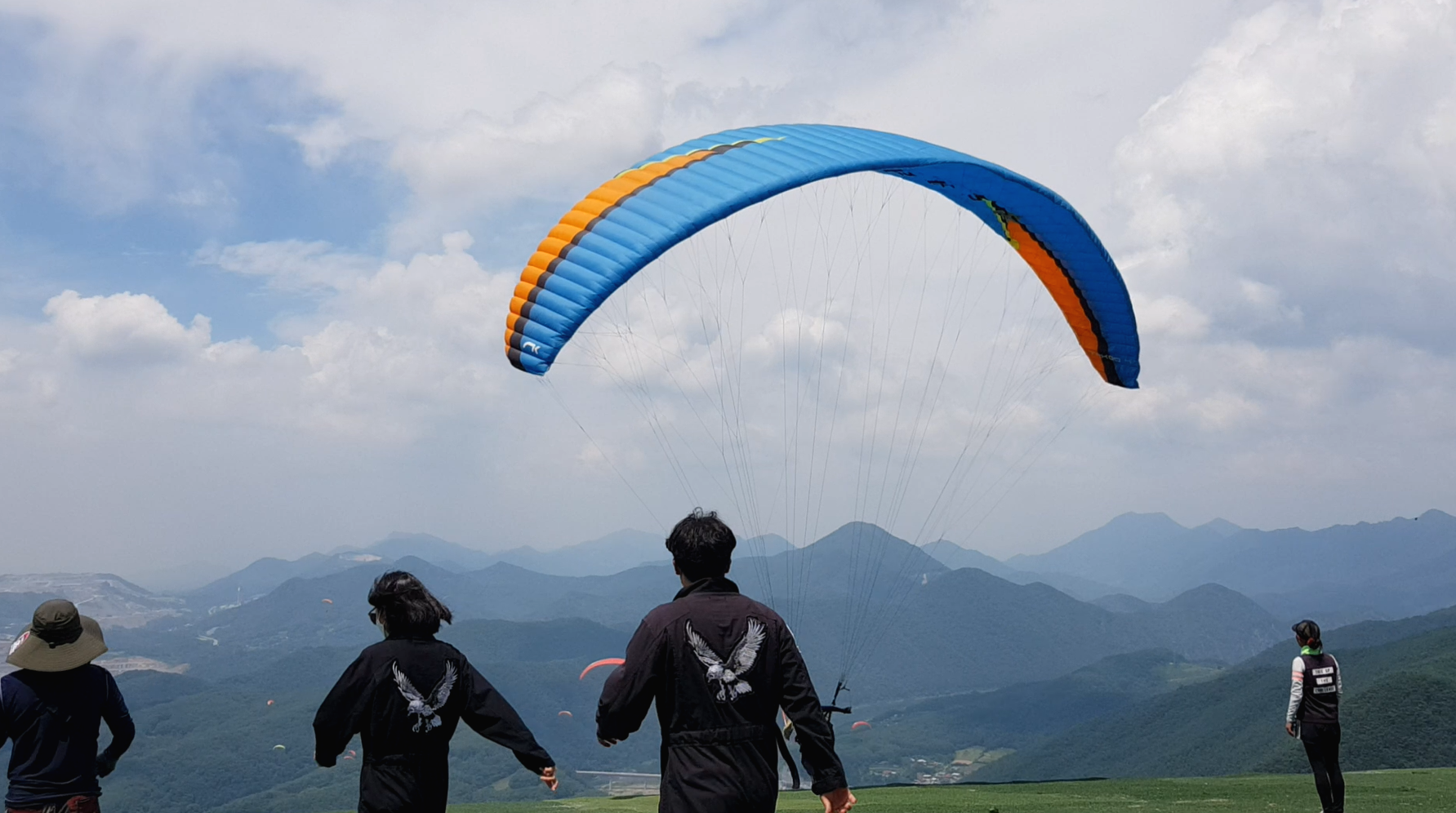 우리는 단체로 패러글라이딩을 예약했습니다.한 10명 정도 갔을 거예요. 멋진 하늘과 패러글라이딩을 하는 사람이 보이나요?고소공포증이 있거나 마음이 약한 분들은 한번 탈 때 고민해보세요! 깨알이긴 하지만 힘든 분들도 있었어요!