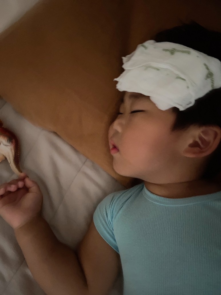 음… 해열제로도 해결이 안되고 미지근한 물로 닦고 이마에 수건을 올려줍니다.