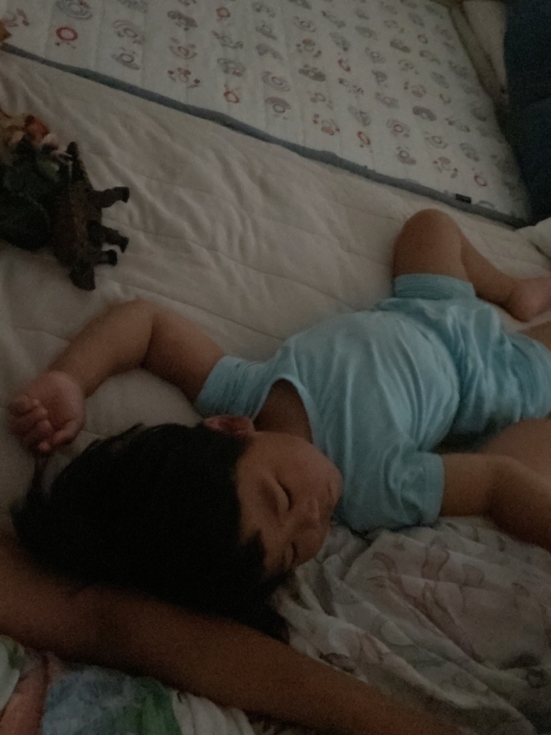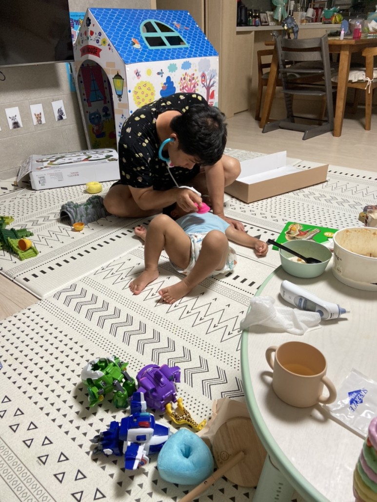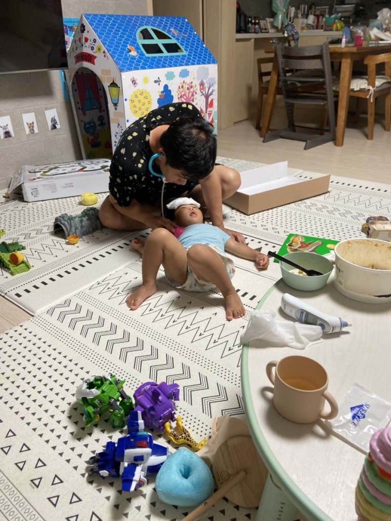 근데 얘가 날아가다니… 진짜 미친 듯이 뛰어다니고 오빠가 병원놀이 하자고 해서 재우고 미지근한 물로 닦아주는 중.