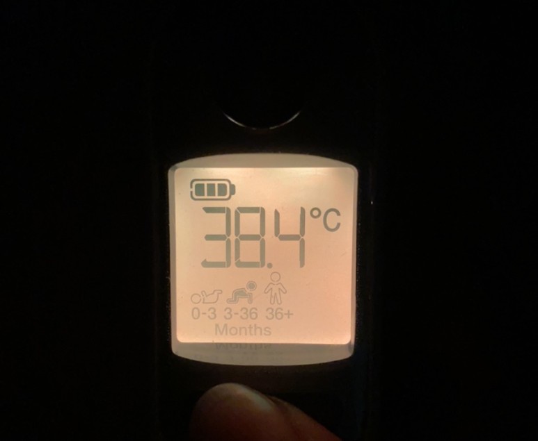 그런데 재웠는데 너무 뜨거운 느낌이 들어 열을 재보니 37도 후반대-새벽 39도를 넘어 해열제를 한 번 먹였는데 떨어진 열이 38도대에서 밤새 내려가지 않았다.
