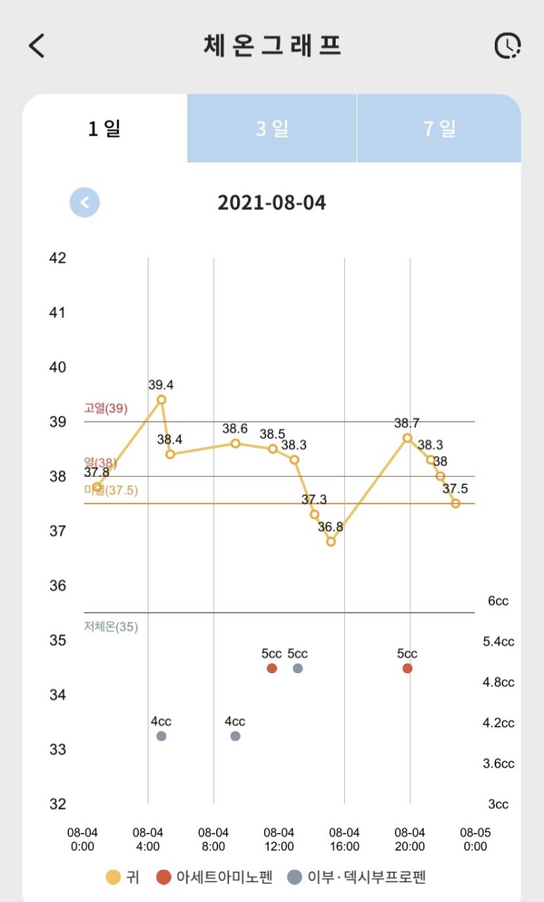 오니는 해열제를 먹고 한시간 뒤 병원에 갔는데 열이 38.4~5일 하루 종일 그랬다. ㅜㅜ(울음)