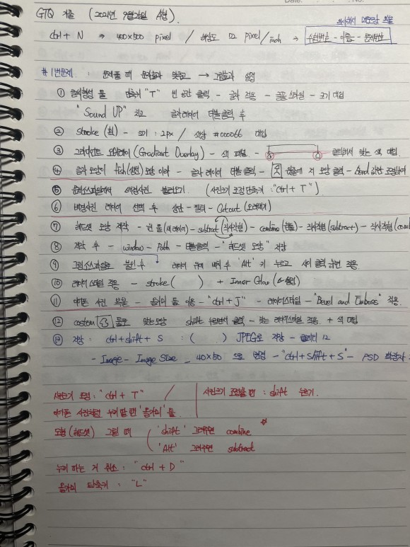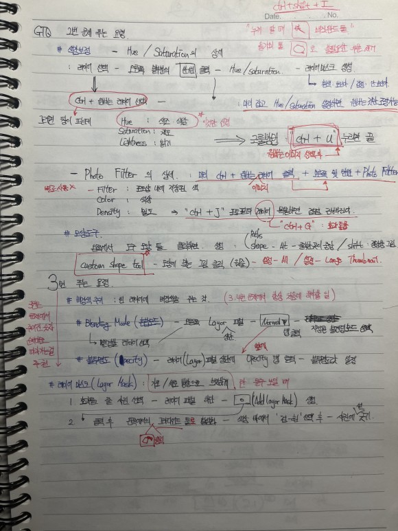 그리고 제 나름대로 노트에 포토샵 툴 기능을 정리하고 암기하면서 공부했습니다.