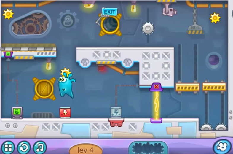이번 무대에서는 약간 머리를 잘 써야 되는데 아무 생각 없이 오른쪽으로 달리다 보면 심각한 전기 감전으로 인해 미션에 실패할 수 있습니다 우선 왼쪽에 있는 장치를 작동시켜서 상단에 있는 빨간 번개 표시가 바닥에 떨어지도록 해야 합니다.
