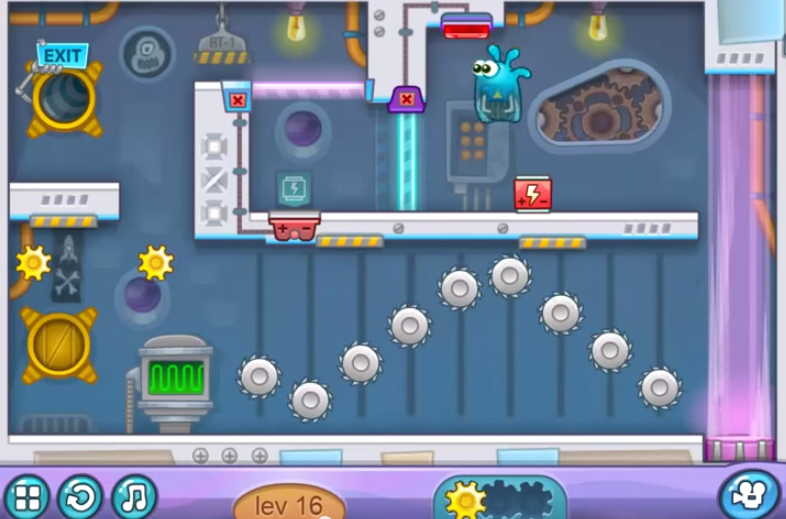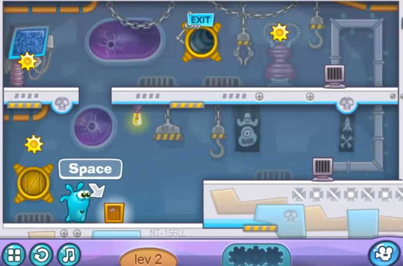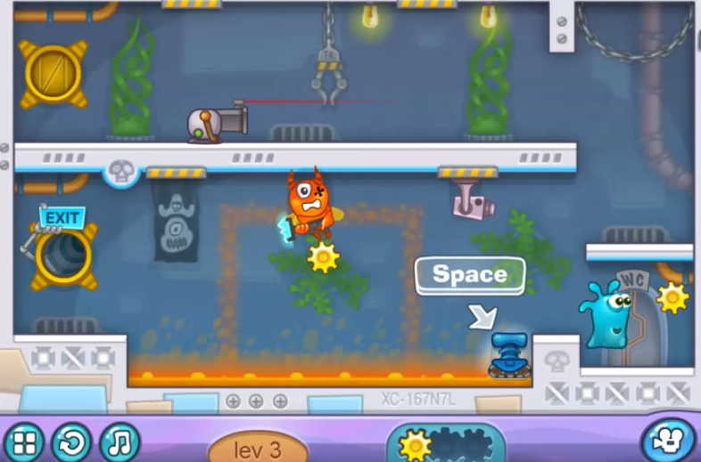 다음으로 위에서 내리면서 톱니바퀴 모양을 2개 획득한 후 아래에 있는 파란색 도구로 이동하여 스페이스 바를 눌러 뜨거운 화염을 기구로 안전하게 마지막 지점인 exit로 이동하여 들어갑니다.